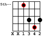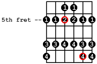 Moving up the neck to the 5th fret, is the next scale form. These are all the same notes as the previous form, just in a different place on the neck. As you can see there are actually 2 different fingerings in this position. You are either going to shift down 1 fret for the 4th and 3rd strings, or stretch with your 4th finger and grab those same notes on the 5th and 4th strings. This scale form is sometimes referred to as the Dorian scale form. If you thought of the first note that you played (A) as the root, this would be the mode A Dorian. Modes are a whole other topic, so don't worry if you don't really understand what that means at the moment. It is just another name for you to refer to this particular scale fingering as. |